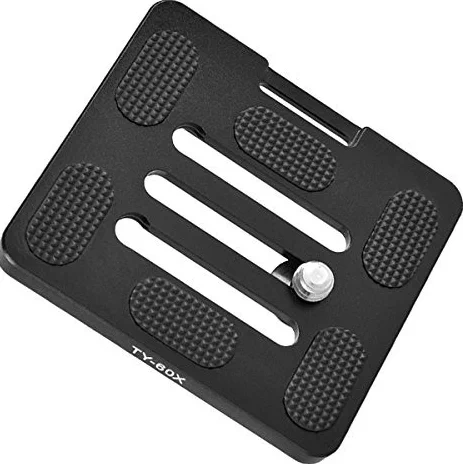 Questa piastra a sgancio rapido SIRUI TY-60X ha una filettatura 1/4 standard per fotocamere e una superficie in gomma per evitare lo slittamento accidentale. La piastra è compatibile con il sistema Arca Swiss.