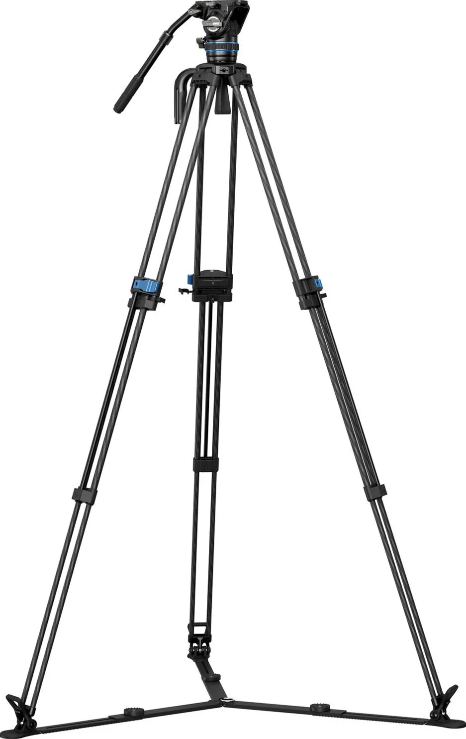 Questo sistema di treppiedi in fibra di carbonio pesa solo 4,3 kg e offre una gamma di altezze da 63,5 cm a 177,8 cm, una piastra per fotocamera a sgancio rapido con caricamento laterale, un attacco per accessori antitorsione da 3/8″-16 e un contrappeso fluido e continuo.